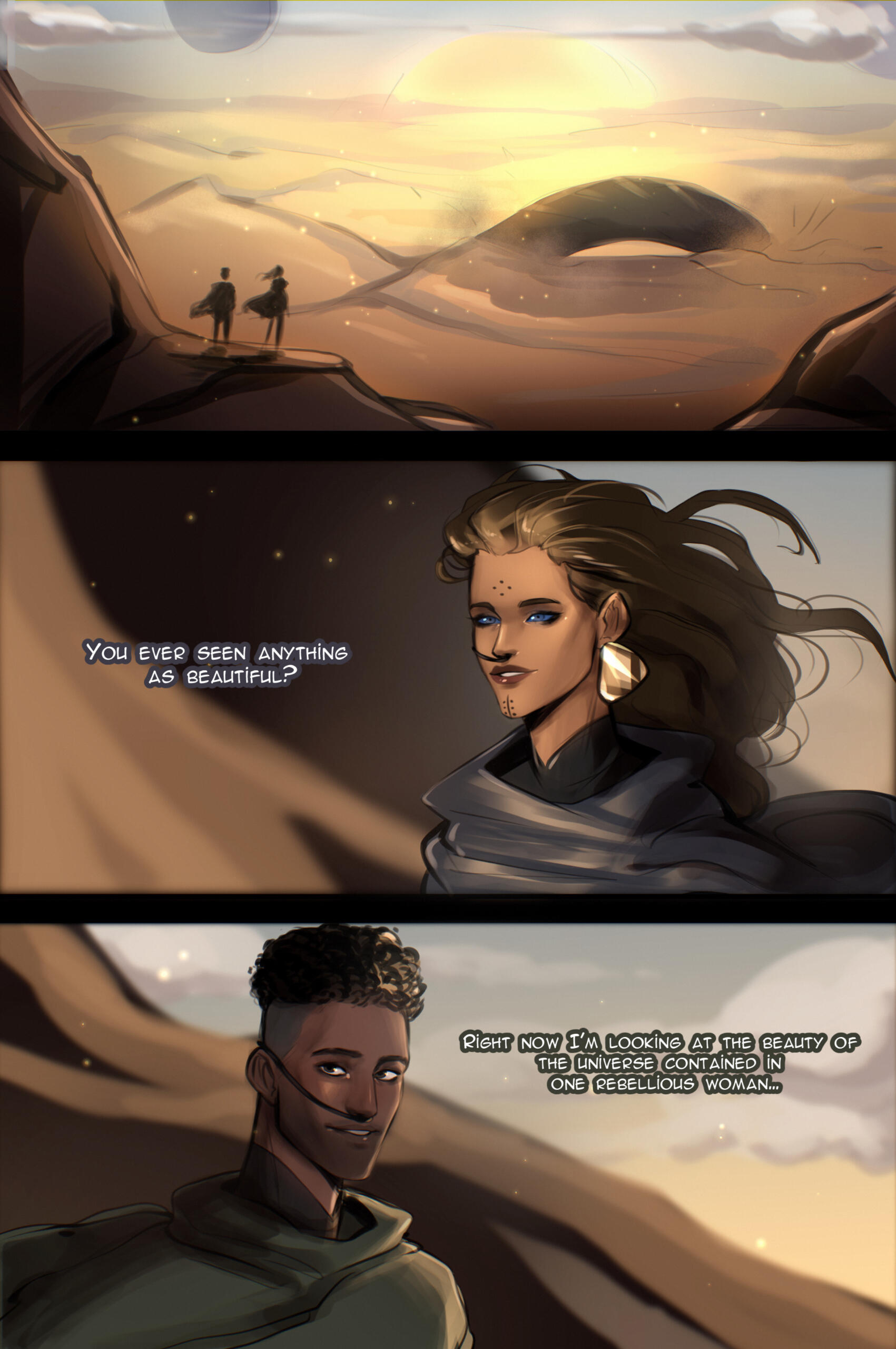 "The desert wind howled loudly as twilight finally settled, bringing the night sky of Arrakis to life. The sands seemed calm nearby, but on the horizon, a colossal shai-hulud moved across the surface before burrowing into the sand after devouring what appeared to be the wreckage of an merchant ship."